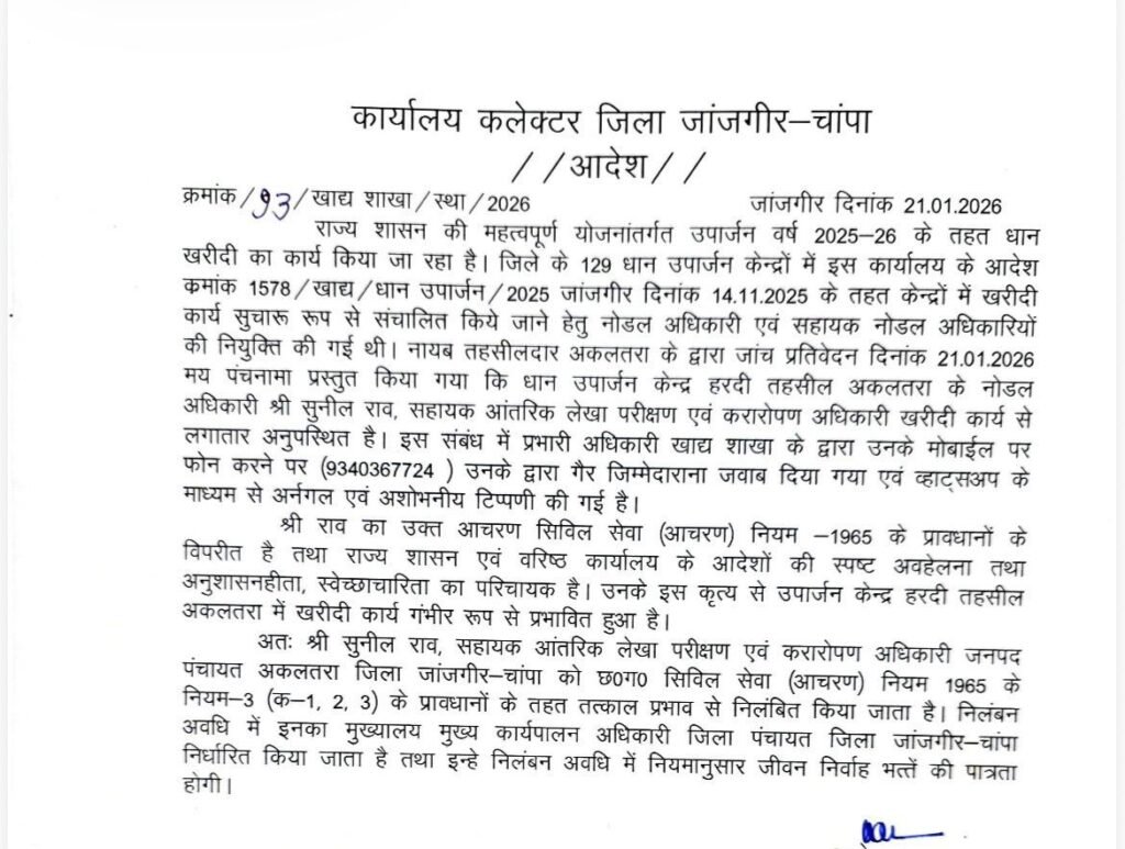 जांजगीर-चांपा । जिले में धान उपार्जन कार्य में लापरवाही और अनुशासनहीनता के मामले में बड़ी प्रशासनिक कार्रवाई की गई है। कलेक्टर जांजगीर-चांपा ने धान उपार्जन केन्द्र हरदी, तहसील अकलतरा के नोडल अधिकारी  सुनील राव को तत्काल प्रभाव से निलंबित कर दिया है।