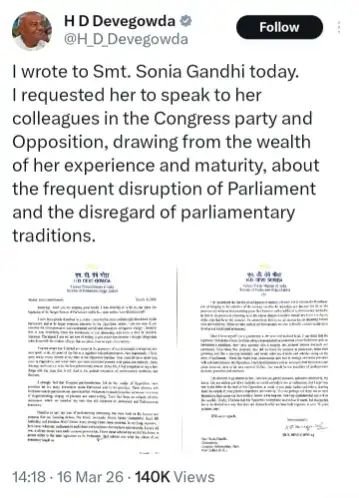 यह पत्र ऐसे समय में आया है जब बजट सत्र के दौरान विपक्ष लगातार सरकार को विभिन्न मुद्दों पर घेर रहा है। देवेगौड़ा के इस पत्र ने अब विपक्ष के भीतर ही एक नई बहस छेड़ दी है, क्योंकि वे खुद एक वरिष्ठ विपक्षी नेता माने जाते रहे हैं।