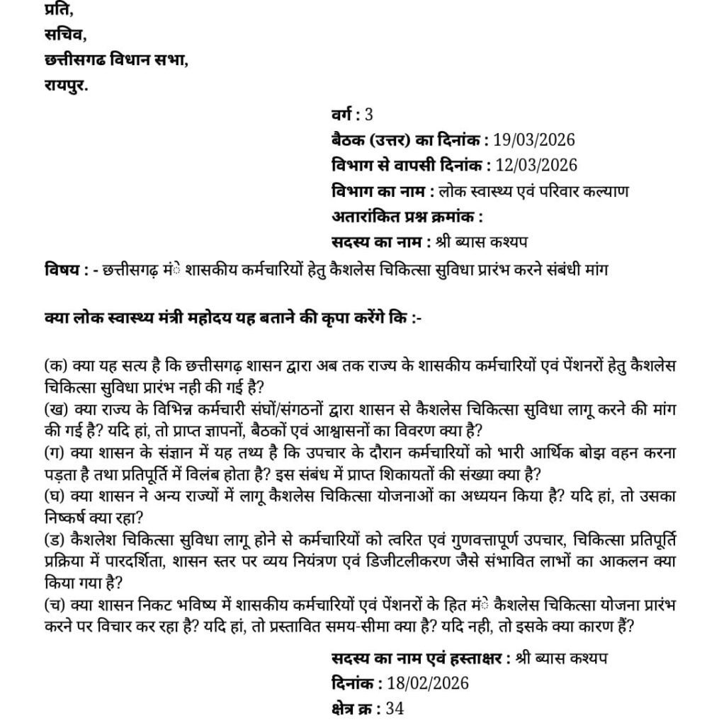 जांजगीर-चांपा विधायक ब्यास कश्यप ने इस विषय को गंभीरता से उठाते हुए पूर्व में स्वास्थ्य मंत्री को पत्र लिखकर शासकीय कर्मचारियों एवं पेंशनरों के लिए कैशलैस चिकित्सा सुविधा लागू करने की मांग की थी। इसके साथ ही उन्होंने बजट सत्र में भी इस संबंध में विधानसभा प्रश्न के माध्यम से सरकार से स्थिति स्पष्ट करने की मांग की।