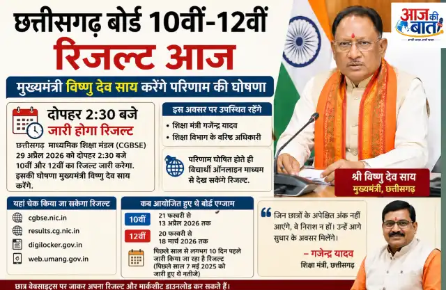 रायपुर। छत्तीसगढ़ माध्यमिक शिक्षा मंडल (CGBSE) के 10वीं और 12वीं बोर्ड परीक्षा 2026 के परिणाम आज जारी किए जाएंगे। परिणाम की घोषणा मुख्यमंत्री विष्णु देव साय नवा रायपुर स्थित मंत्रालय में करेंगे।