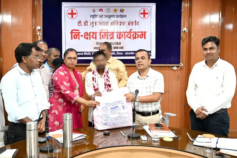 जांजगीर-चांपा, 6 अप्रैल 2026। कलेक्टर जन्मेजय महोबे ने टीबी उन्मूलन अभियान के तहत ‘निक्षय मित्र’ बनकर 5 टीबी मरीजों को पोषण आहार किट वितरित किए। इस पहल के माध्यम से उन्होंने मरीजों के उपचार में पोषण की अहम भूमिका पर जोर दिया।