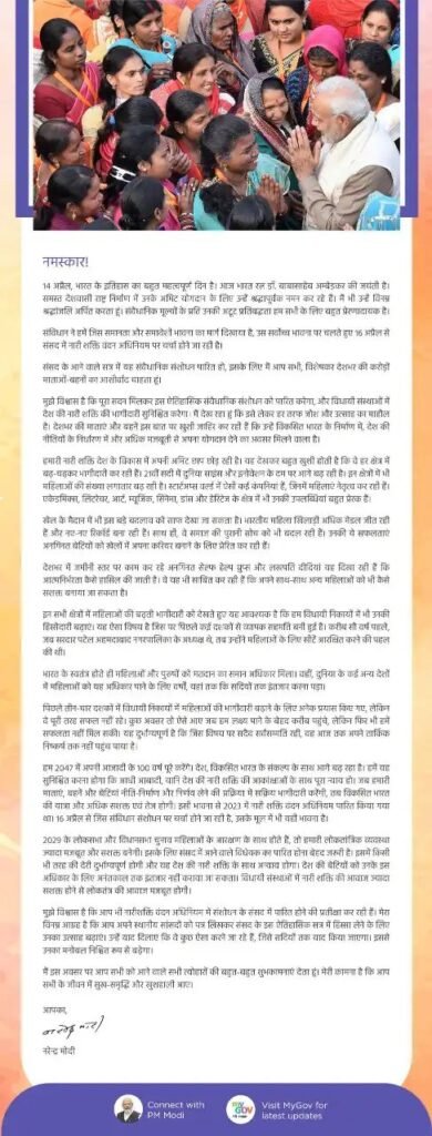 नई दिल्ली। प्रधानमंत्री नरेंद्र मोदी ने 14 अप्रैल को भारत रत्न डॉ. बाबा साहेब आंबेडकर की जयंती के पावन अवसर पर देश की नारी शक्ति को एक विशेष पत्र लिखा है। पत्र की शुरुआत में प्रधानमंत्री ने बाबा साहेब को याद करते हुए उन्हें श्रद्धांजलि अर्पित की और राष्ट्र निर्माण में उनके योगदान को नमन किया। उन्होंने कहा कि संविधान ने हमें जिस समानता और समावेशी भावना का मार्ग दिखाया है, उसी राह पर चलते हुए ‘नारी शक्ति वंदन अधिनियम’ को साकार किया जा रहा है।