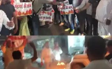 एलपीजी की कीमतों में भारी वृद्धि के खिलाफ कांग्रेस का प्रदर्शन, चांपा में फूंका प्रधानमंत्री का पुतला