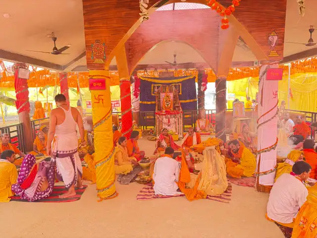 यज्ञाचार्य: अयोध्या धाम के पंडित श्री तुंगनाथ शास्त्री जी महाराज विधि-विधान से अनुष्ठान संपन्न करा रहे हैं।